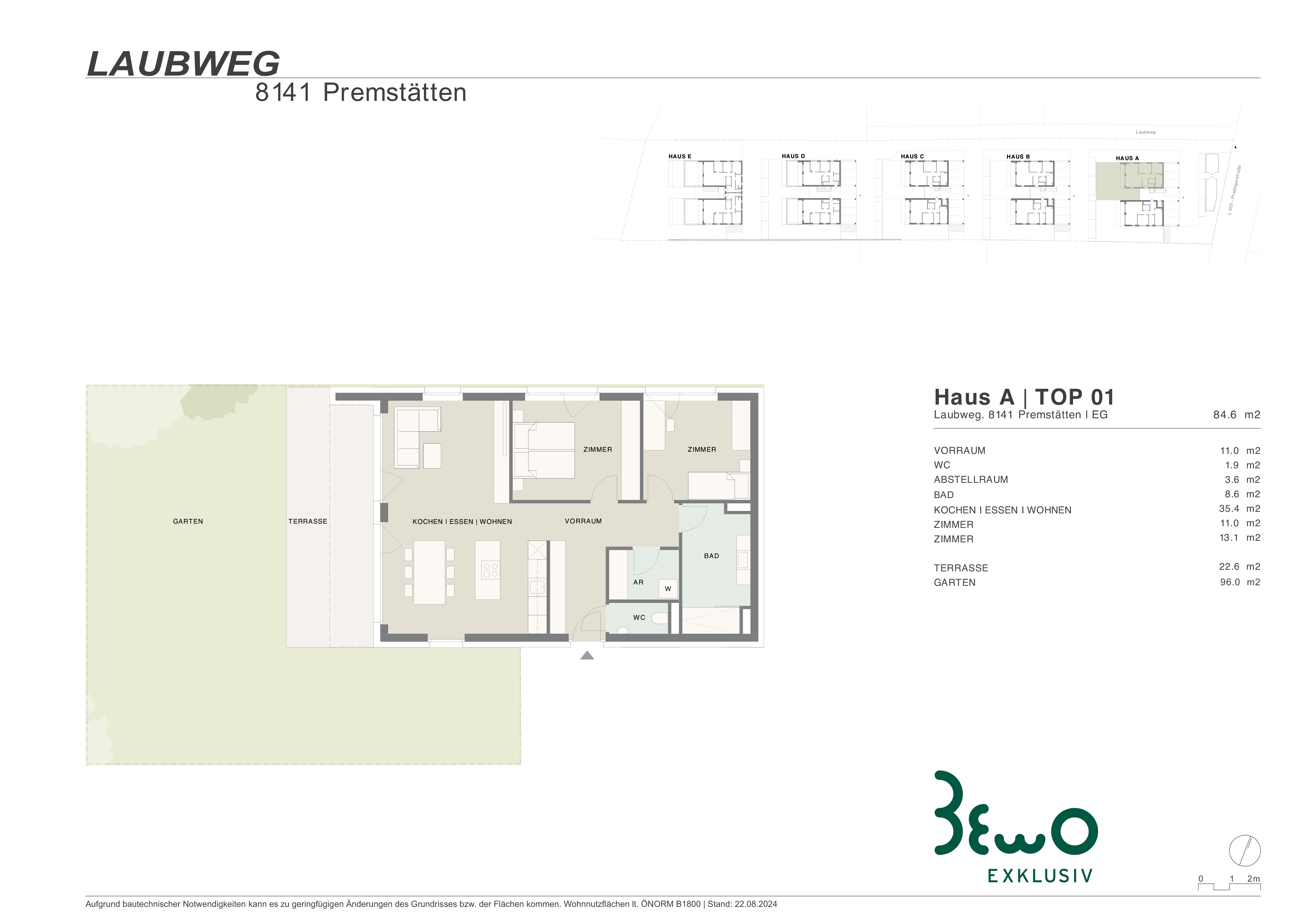 Die 84,60 m² große Neubauwohnung Top 01 liegt im Erdgeschoß des Hauses A und verfügt über einen ca. 96 m² großen süd-seitigen Garten und eine ca. 23 m² große südwest-seitige Terrasse, die vom Wohnbereich aus erreichbar sind. Die Wohnung teilt sich in einen Vorraum, ein ca. 35 m² großes Wohn-Esszimmer, 2 Schlafzimmer, einen Abstellraum mit Waschmaschinenanschluss, ein Badezimmer mit bodenebener Walk-In Dusche mit Echtglas Duschwand sowie ein extra WC. Die Wohnung ist mit Parkettböden und Fußbodenheizung ausgestattet, die raumhohen Balkontüren und Fenster-Elemente sorgen für ein lichtdurchflutetes Zuhause, elektronische Raffstores für die gewünschte Beschattung. Die Wohnanlage ist mit einer Photovoltaikanlage und einer über ein Erdwärme-Tiefensondenfeld betriebenen Wärmepumpe ausgestattet - für eine ökologisch nachhaltige und kostengünstige Energieversorgung. Mittels der einzelraumgeregelten Fußbodenheizung und der Bauteilaktivierung können Sie die Wohnung sowohl im Winter als auch im Sommer angenehm temperieren!