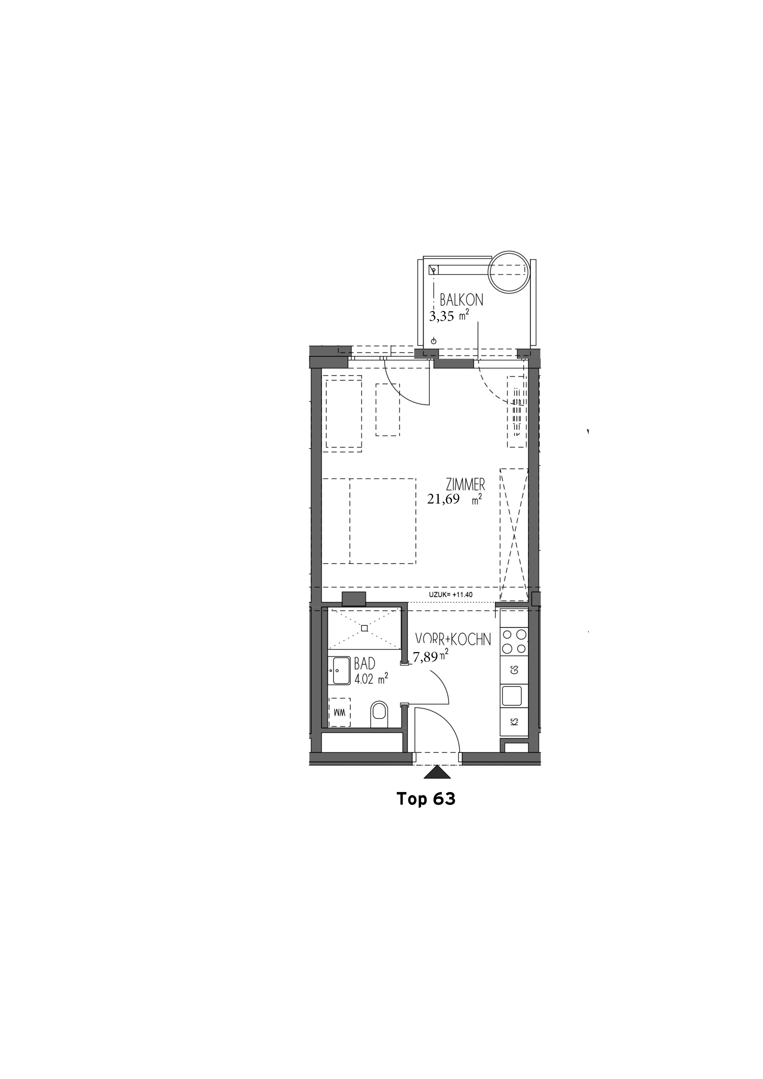 Die Neubau Wohnung Top 63 liegt im 3. Obergeschoss und ist bequem per Lift erreichbar. Sie verfügt über ein ca. 22 m2 großes Zimmer, einen Vorraum in dem auch die voll eingerichtete Küchenzeile (mit AEG Küchengeräten) untergebracht ist, sowie ein Bad mit Walk-In Dusche, Sprossenheizkörper, Waschmaschinenanschluss und WC. Zur Wohnung gehört ein ca. 3 m2 großer östlicher Balkon der vom Zimmer aus begehbar ist.