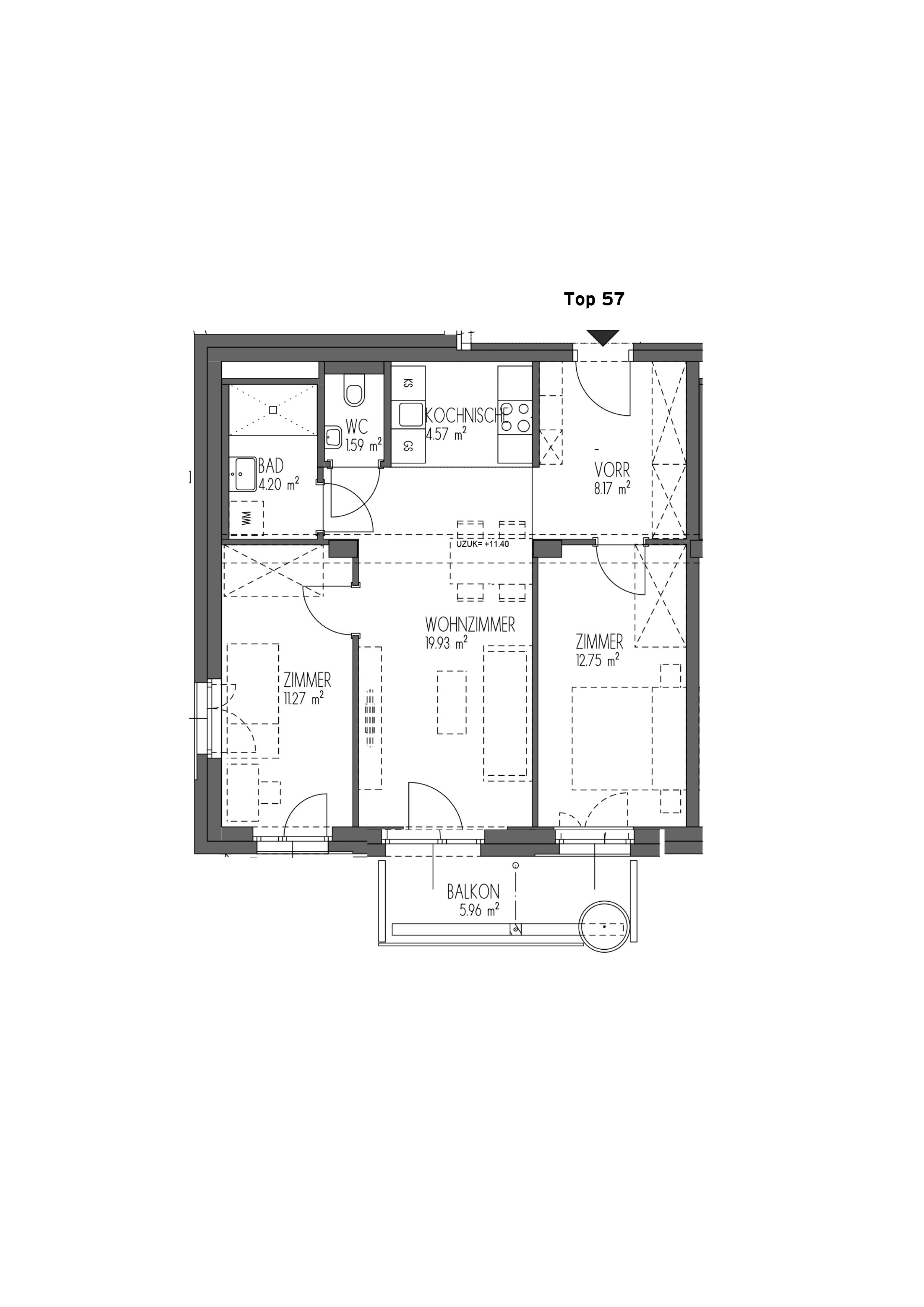Die Neubau Wohnung Top 57 liegt im 3. Obergeschoss und ist bequem per Lift erreichbar. Sie ist nach Westen ausgerichtet und verfügt über ein großzügiges, ca. 20 m2 großes Wohn-Esszimmer, eine Kochnische inkl. voll eingerichteter Küchenzeile (mit AEG Küchengeräten), zwei Zimmer, ein Bad mit Walk-In Dusche, Sprossenheizkörper, Waschmaschinenanschluss, ein extra WC und einen Vorraum. Zur Wohnung gehört ein ca. 6 m2 großer westlicher Balkon, der vom Wohn-Esszimmer aus begehbar ist.