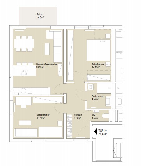Die 71,43 m2 große Neubau-Wohnung Top 10 liegt im 2. Obergeschoß und verfügt über einen ca. 5 m2 großen Balkon. Sie teilt sich in einen Vorraum, ein ca. 24 m2 großes Wohn-Esszimmer mit voll eingerichteter Küchenzeile, 2 Schlafzimmer (alle Zimmer getrennt begehbar!), ein Badezimmer mit Dusche und Waschmaschinenanschluss sowie ein extra WC. Der Balkon ist vom Wohn-Esszimmer aus begehbar.