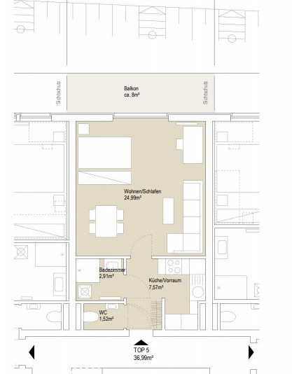 Die 36,99 m2 große Neubau-Wohnung Top 05 liegt im Erdgeschoß und ist bequem mit Lift erreichbar. Sie verfügt über einen ca. 8 m2 großen Balkon. Sie teilt sich in einen Vorraum, einen Wohn-Schlafraum mit Zugang zum Balkon, eine Küchennische mit voll eingerichteter Küchenzeile, ein Badezimmer mit Dusche und ein extra WC.