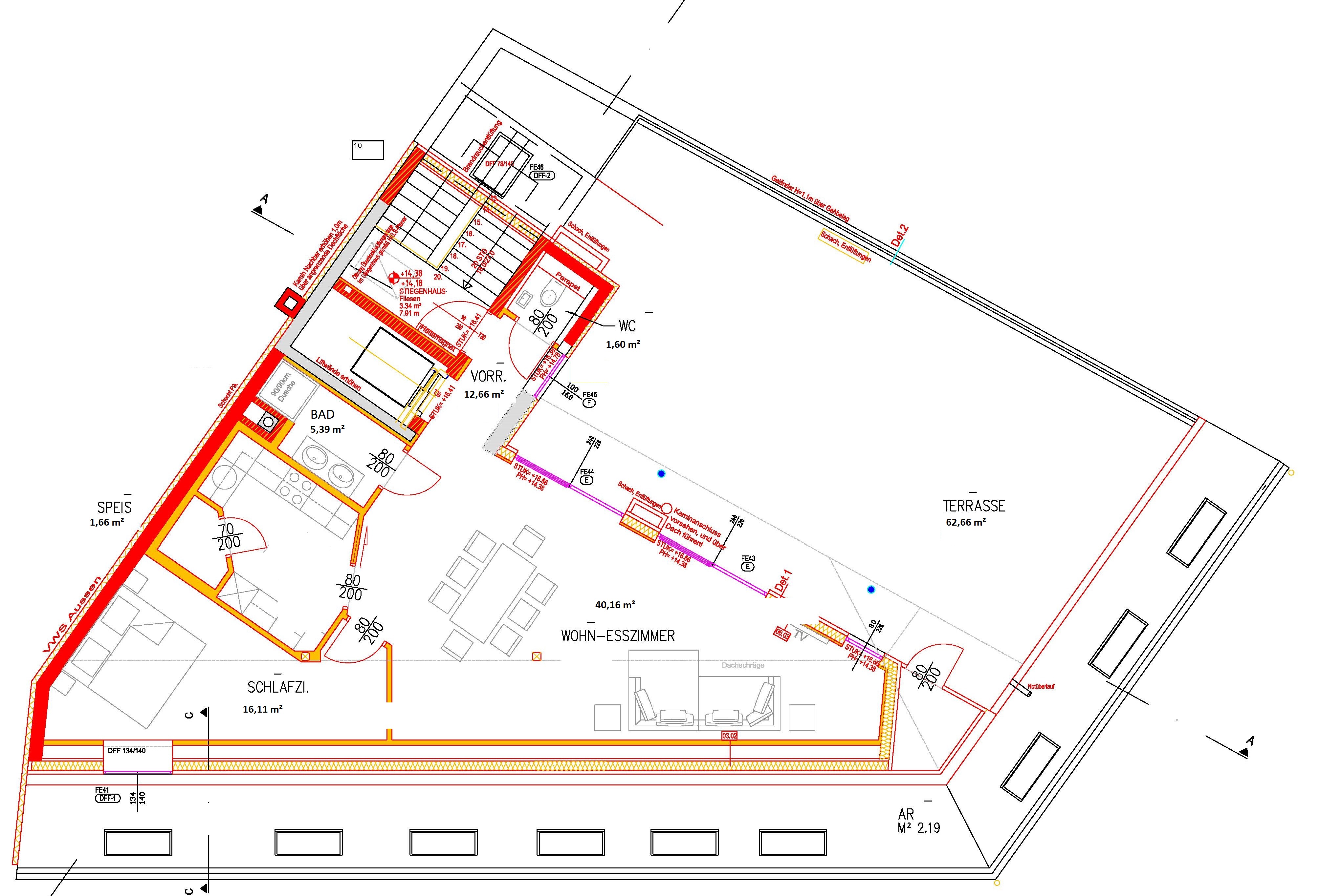 Die sehr helle Wohnung hat zwei Zimmer mit rund 78 m2 Wohnnutzfläche und erstreckt sich über das gesamte oberste Stockwerk des Gebäudes. Der Lift führt direkt in die Wohnung, alle Räume sind vom Vorraum aus getrennt begehbar. Die Wohnung ist mit einer räumlich abgetrennten Kochnische samt E-Geräten und extra Speis ausgestattet, vom großzügigen Wohn-Esszimmer aus gelangen sie auf die sensationelle Terrasse, die den Wohnbereich optimal erweitert. Das zweite Zimmer ist ebenso direkt vom Vorraum aus begehbar. Das Badezimmer verfügt über eine Dusche und zwei Waschbecken. Das WC ist extra.