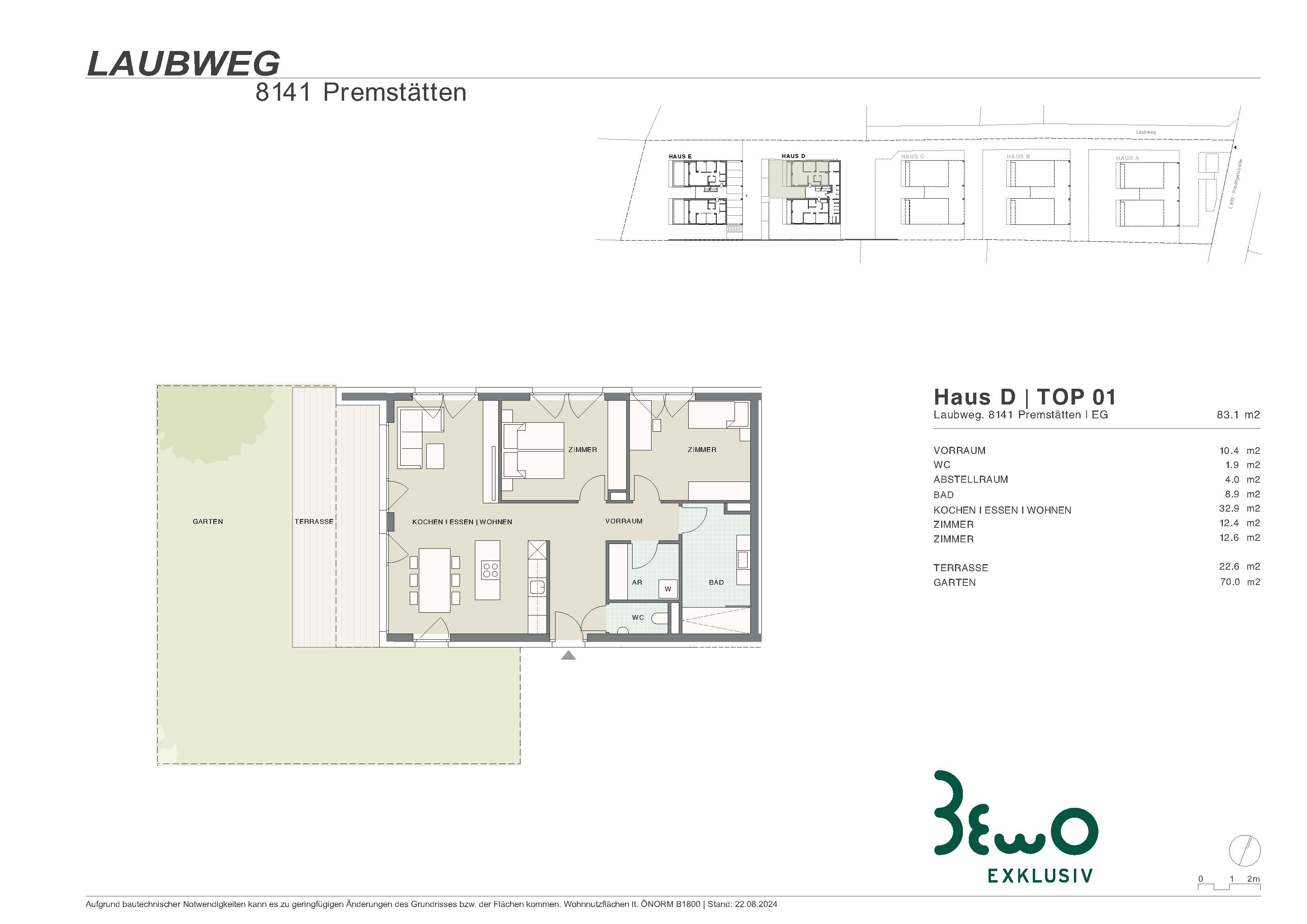 | Top Haus D Top 01 | Erdgeschoß | ca. 83,10 m2 | 3 | ca. 22,60 m2 | ca. 70,00 m 2 | Anzeigen | - | |
